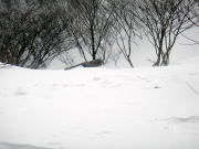 とてもこれ以上進めそうも無く、引き返すこと(下山)も考えたのですが・・・少し引き返して、斜面のゆるいほうを選び登山道の脇下を進むことにしました。ここは、なんとか膝ほどの積雪なので進めます。特に、雪の上に笹の葉が見えるところは、歩きやすかったです。笹があれば下には、確実に地面がありますし。